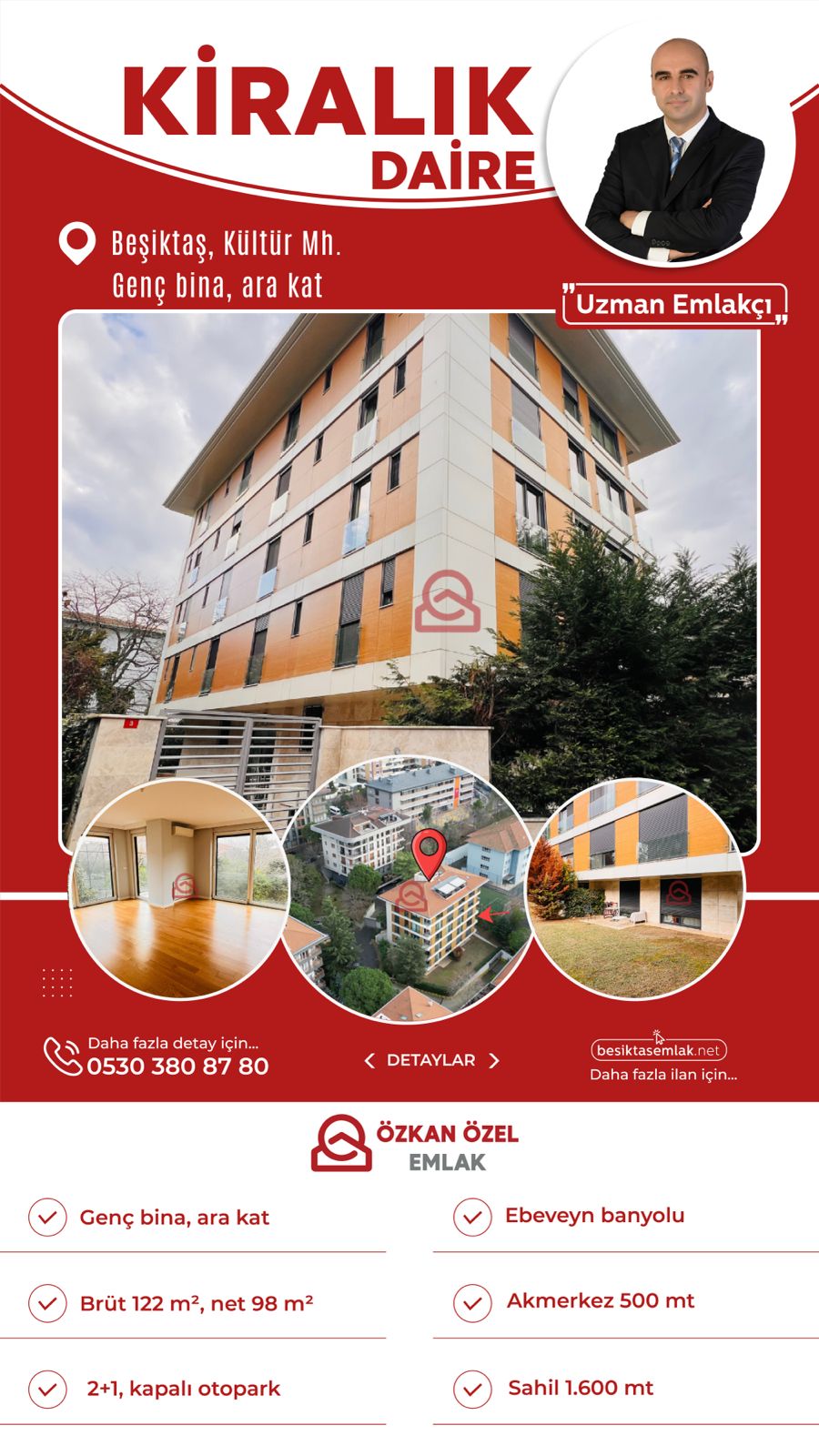 Özkan ÖZEL Emlak’tan Beşiktaş’ın kıymetli yaşam alanlarından Kültür Mh’nde genç binada ara kat kiralık 2+1 daire.